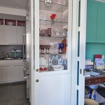 Custom built appliance enclosure with pocket doors and solid surface countertop