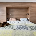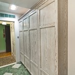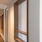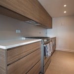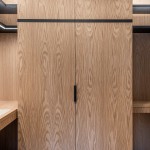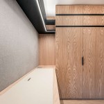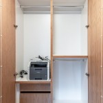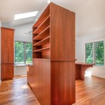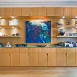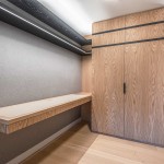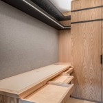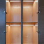 Master closet with full-sized flush mount closet doors in natural wood veneer with satin conversion varnish finish with LED closet rods and light sensors. Detached coffee bar with fixed shelving unit complete with flush mounted LED light fixtures.