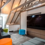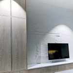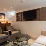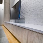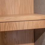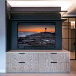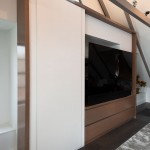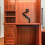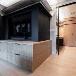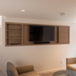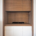 New custom made entertainment unit with pull-out storage in natural wood veneer with conversion varnish satin finish.