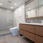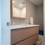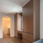 New custom made vanity in wood veneer with conversion varnish finish, blum hardware and custom stone tops.